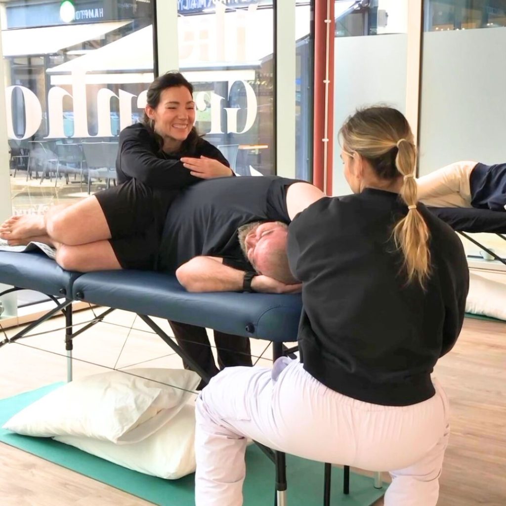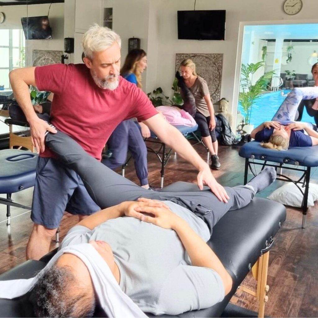 The main training is taught in levels. Level 1 introduces a sequence of full-body stretches designed to be both teachable and effective. The structure helps students absorb a large amount of information while developing hands-on confidence. Therapist positioning and body mechanics are a key part of the work—not just for the outcome of the stretch, but to ensure it feels sustainable for the practitioner too. The course is practical and immersive, with students alternating between receiving and delivering the work. Learning to feel, listen, and respond is as important as getting the technique right.